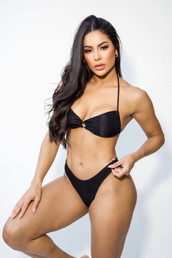 O Biquíni Âmbar Preto é sinônimo de elegância e sensualidade atemporal. O top com aro central embutido realça o busto e garante um caimento impecável, enquanto a amarração posterior ajustável permite ajuste perfeito ao corpo, oferecendo conforto e sustentação. A calcinha modelo asa delta com fio duplo alonga a silhueta e valoriza as curvas com sofisticação. Confeccionado em tela texturizada com brilho sutil, o conjunto proporciona elasticidade, conforto e um visual refinado para brilhar em qualquer ocasião.